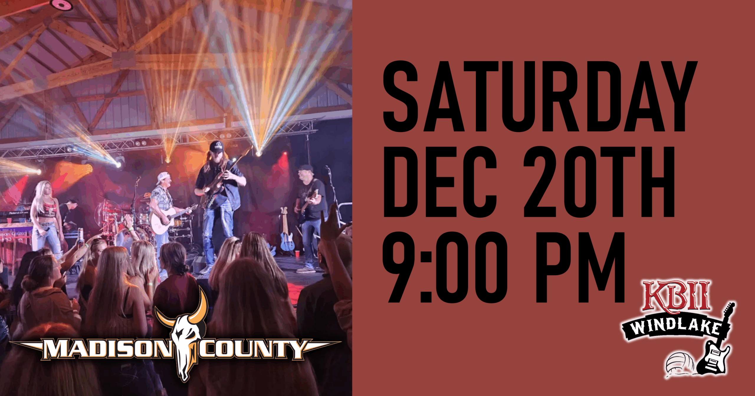 Madison County is a 7-piece country show band, based out of Madison, WI, that has evolved its high-energy, engaging show over the years to stay fresh and distinctive. They have been voted Local Group of the Year 9 years in a row at the Q106 MCMA (Madison Country Music Awards), Favorite Local Group at the 96.3 Star Country Awards, Country Artist of the Year at the MAMA Awards (Madison Area Music Association), People’s Choice Award Winner for 6 years at the WAMI Awards (Wisconsin Area Music Industry), WAMI Country Performer of the Year 2025, WAMI Country Album of the Year 2025 “Three Sheets to the Wind”, WAMI Country Song of the Year 2025 “That Waylon Sound”, Isthmus Readers Favorite Local Country Band, Madison.com People’s Choice Local Band/Musician 3 years running, and Madison Magazine’s Best of Madison Local Band and Country Band, 7 years running. Madison County has also been acknowledged with a Meritorious Achievement Award at the MAMA Awards, for raising their incredible fan base to such astronomical numbers.